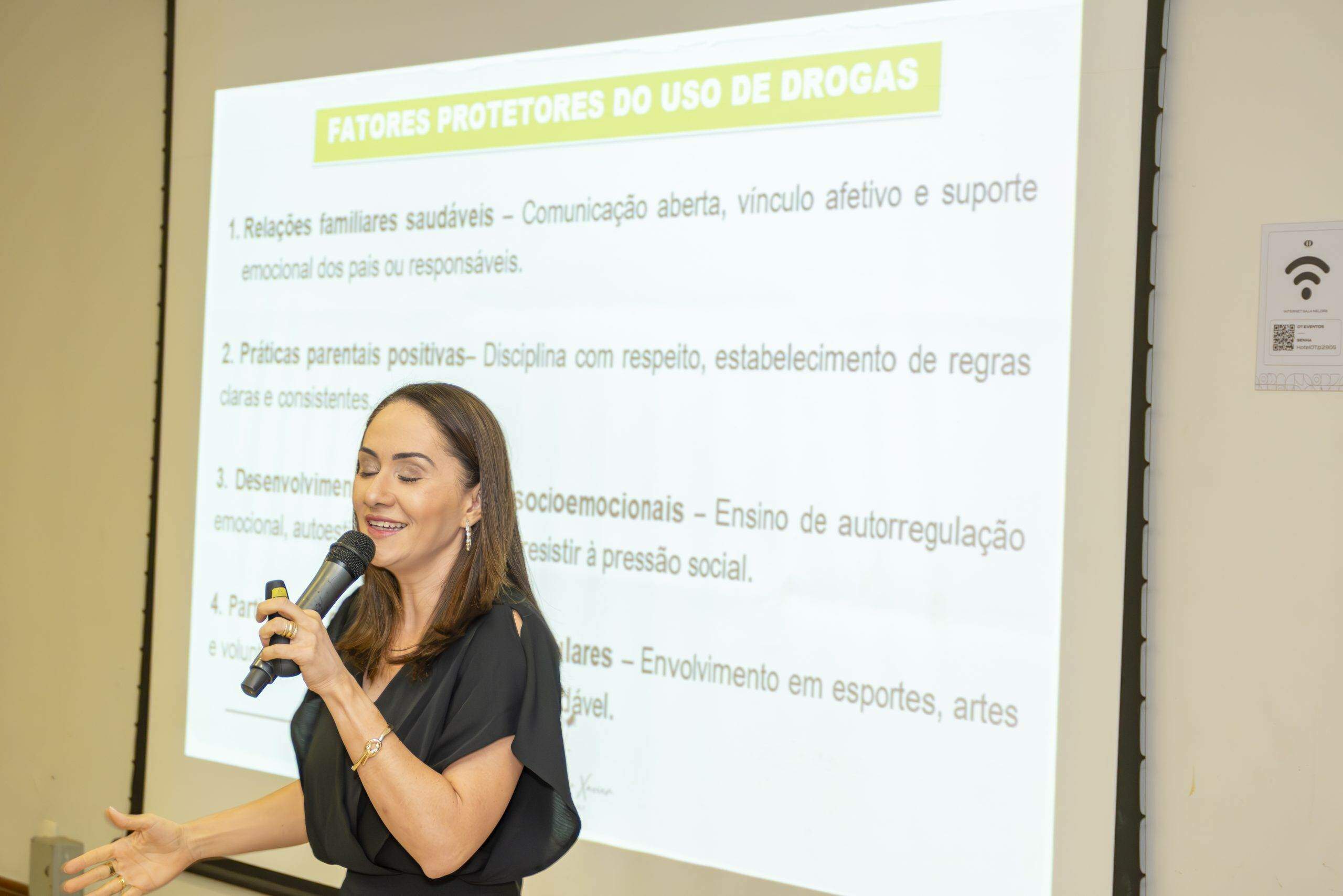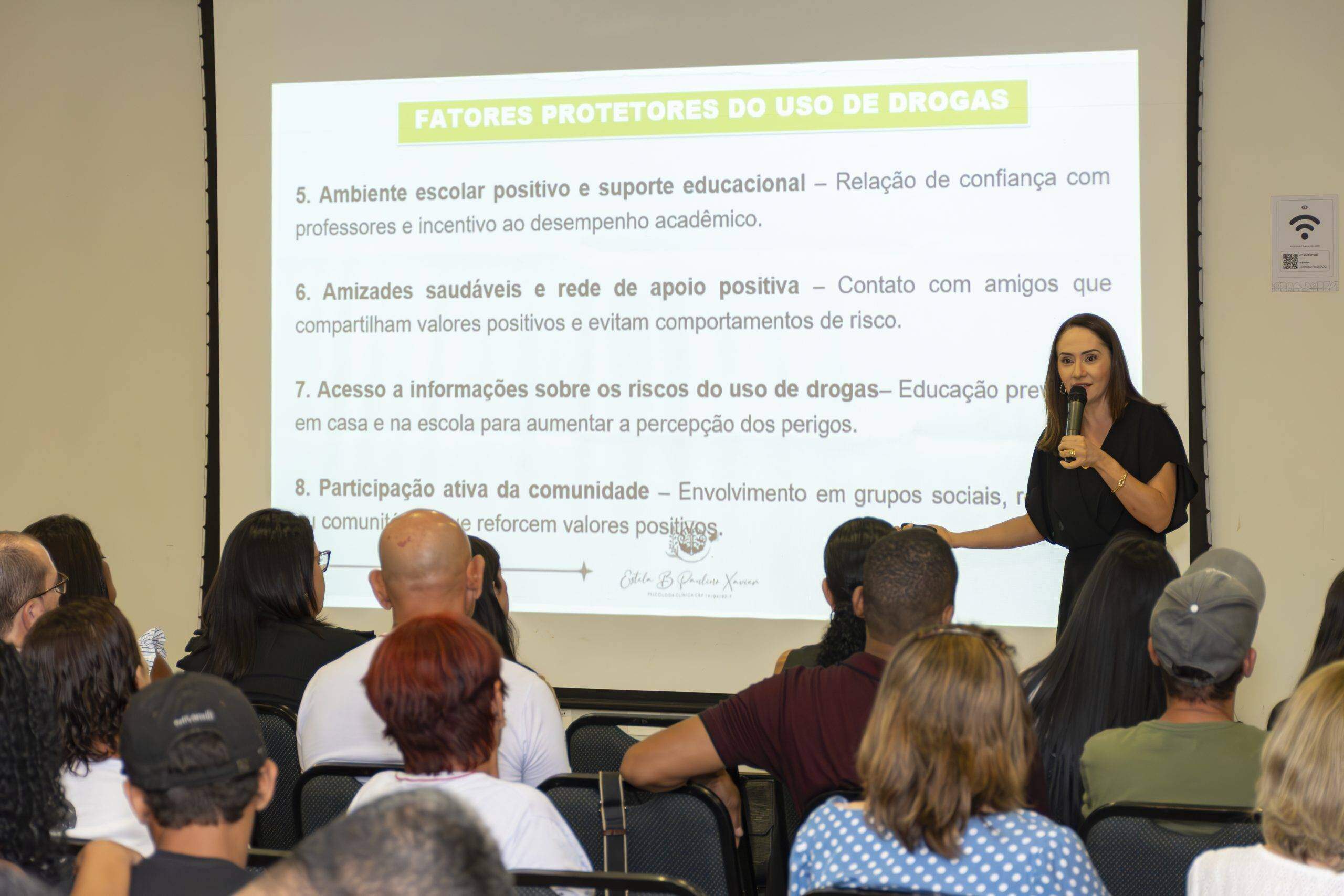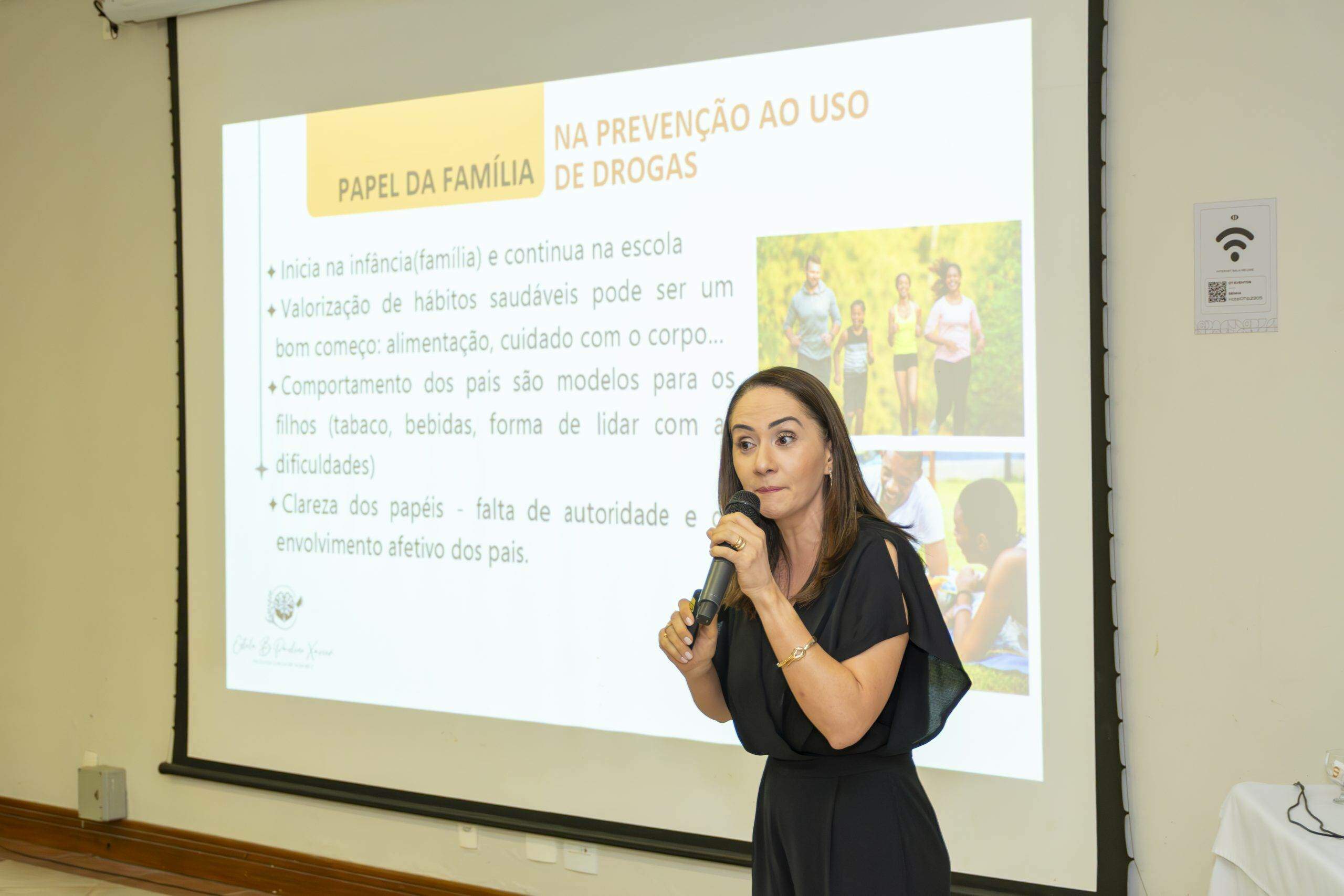 Durante a fala, ela utilizou linguagem simples e acessível, fez uso de gráficos e informações atualizadas sobre a importância da família nesta luta árdua, mas que pode ser vencida contra o uso de drogas. Muitas experiências e estratégias foram abordadas, no sentido de fortalecimento dos familiares na proteção dos jovens.