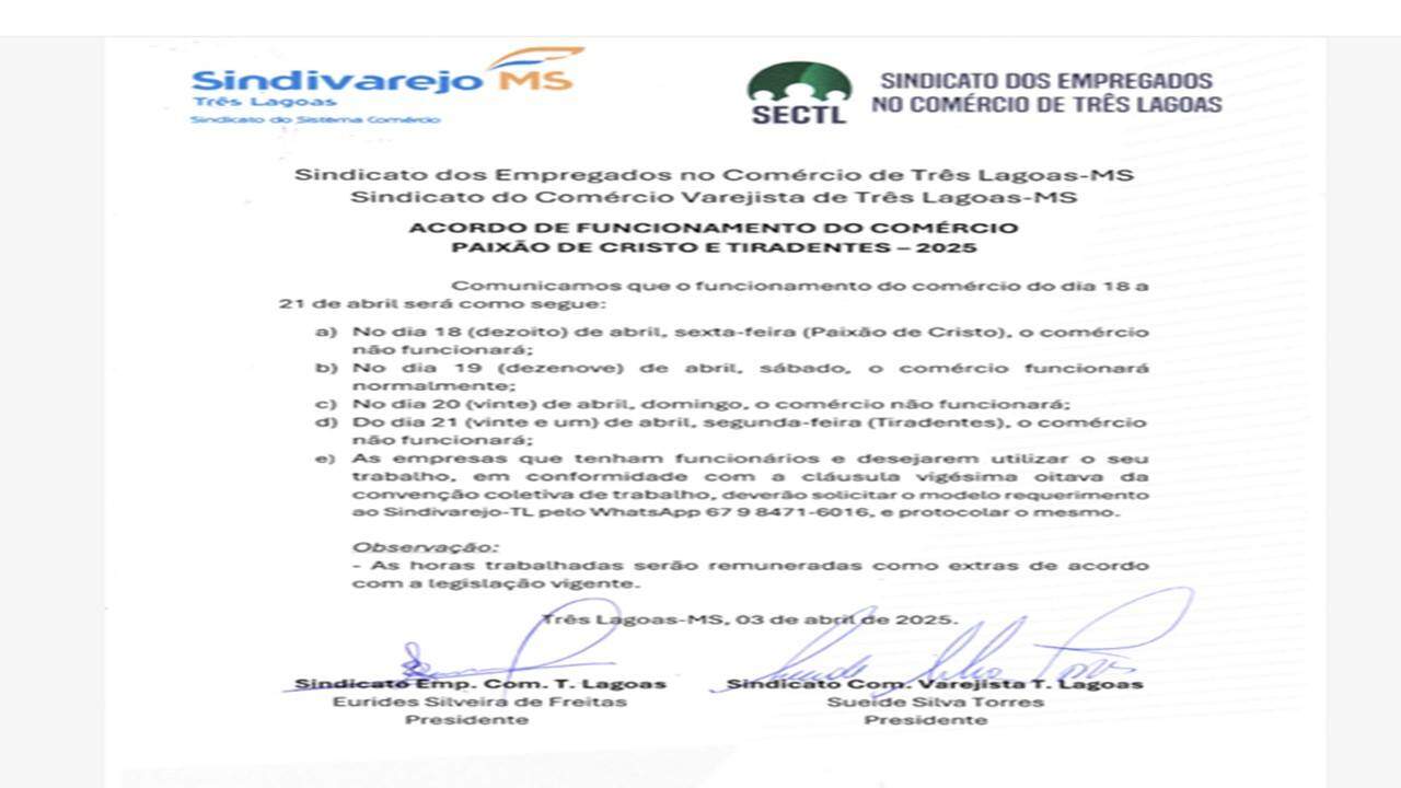 O SECTL (Sindicato dos Empregados no Comércio de Três Lagoas), comunicou o horário de funcionamento durante o feriadão de 18 a 21. Segundo o documento assinado pela classe trabalhadora e patronal, o comércio seguirá da seguinte forma: