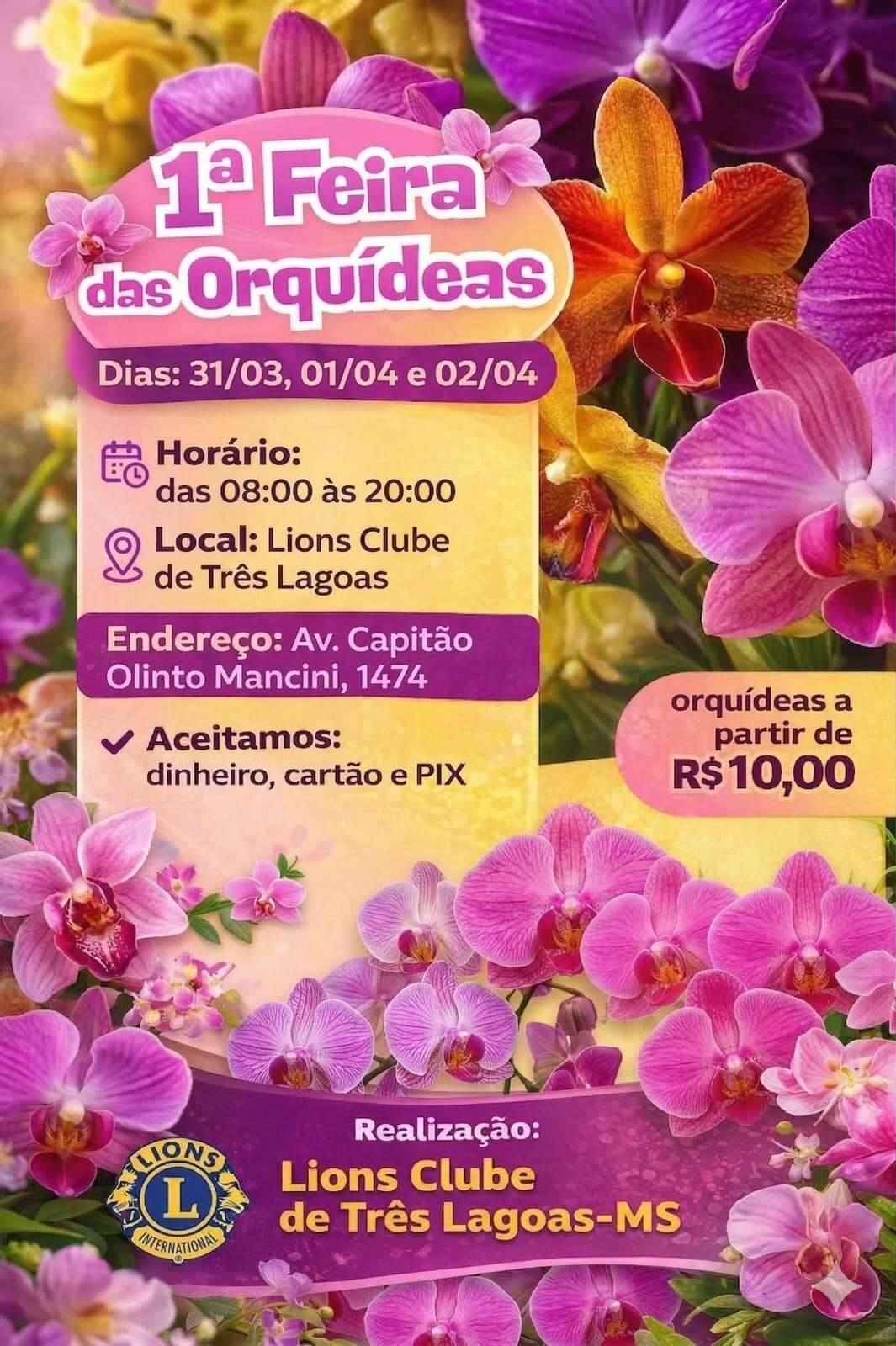 A forte equipe do Lions Clube de Três Lagoas está convidando todos para participarem da sua 1ª Feira de Orquídeas.