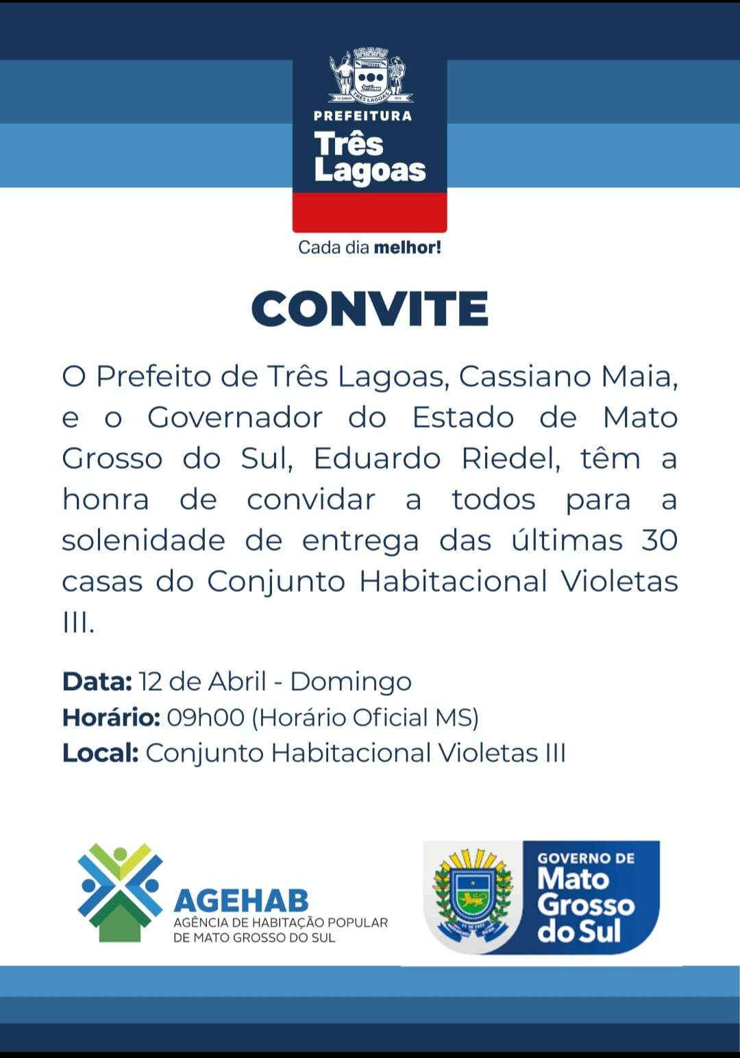 A festa será completa com a presença do governador Eduardo Riedel, que além do abraço no prefeito, também estará na entrega das 30 chaves, que representam a realização do maior sonho dos beneficiados e beneficiadas.