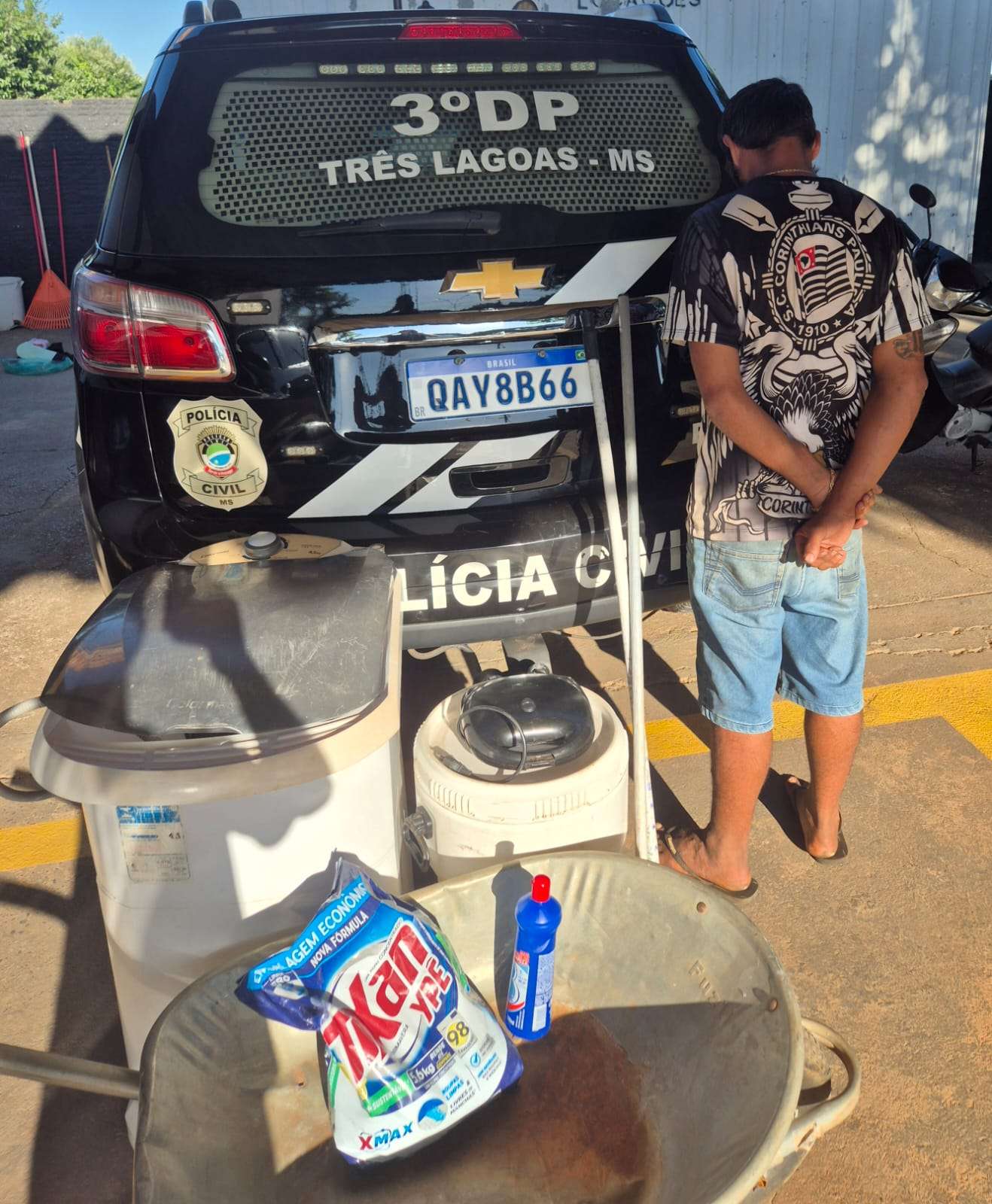 Segundo apurado, após arrombar o portão de entrada, o indivíduo subtraiu diversos objetos, entre eles um tanquinho, uma carriola, produtos de limpeza, rastelo, sanduicheira, alimentos, tambores e materiais escolares.